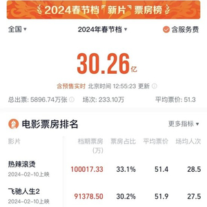 截至2月12日12时38分,据灯塔专业版数据,2024年春节档(2月10日-2月17日)档期总票房(含预售)突破30亿!《热辣滚烫》《飞驰人生2》《熊出没·逆转时空》暂列档期票房前三位。