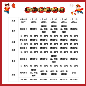 2月12日~17日(初三~初八),受东南气流影响,海南全岛以晴到多云天气为主,其中13日~16日海南岛五指山以北地区(海口、定安、屯昌、琼中、澄迈、儋州、临高、文昌、琼海、白沙、五指山等市县)早晨有雾。各地气温逐日回升,最低气温内陆地区15~18℃,沿海地区19~22℃;最高气温大部地区将升至26~31℃。