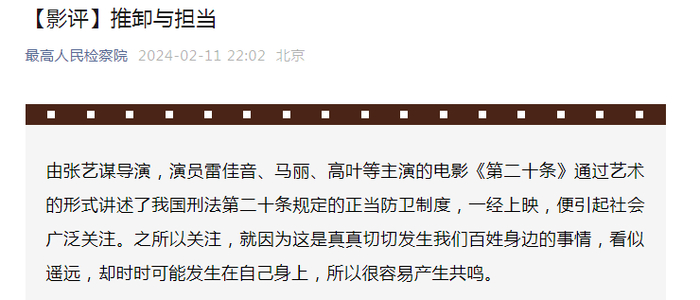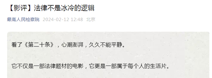 最高检2月12日又发布署名为北京市人民检察院第一检察部副主任、三级高级检察官刘哲的影评《法律不是冰冷的逻辑》。文章作者称,看了《第二十条》,心潮澎湃,久久不能平静。它不仅是一部法律题材的电影,它更是一部属于每个人的生活片。当然,第二十条指的就是刑法第二十条,也就是正当防卫的这个条款。这个条款是那么熟悉,又那么陌生。内容大致都是知道的,但是我们又有多少人真正了解它的本质含义,以及那沉甸甸的分量。它砸在人头上,就是一个人的命运,甚至是一个家庭的命运,以及名誉、尊严、自由这些最可宝贵的东西。它会影响一个人的是非观和正义感。