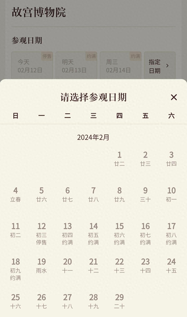 据故宫博物院门票预约小程序显示,2月12日(初三)至17日(初八),故宫博物院已经全部约满。此外,国家博物馆、南京博物院、上海博物馆等今年春节假期门票也已全部预约完。