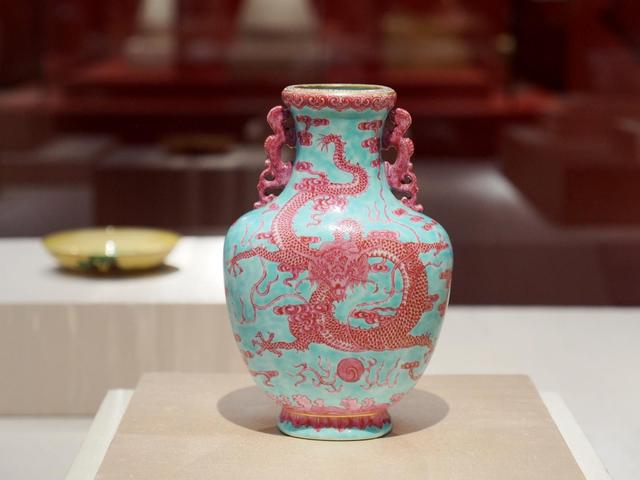 “龙肇新元——甲辰龙年新春文化展”上展出的“乾隆款松石绿地胭脂彩云龙纹螭耳扁瓶(清)” 图据IC photo