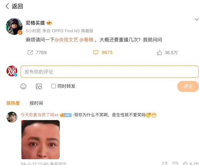尼格买提下午发文问@央视文艺 @春晚 :“(春晚)大概还要重播几次?我就问问 ”。对此,网友问:哥你为什么不笑啊,是生性就不爱笑吗 。随后, 尼格买提在评论区回应:对,三天没笑过了。“尼格买提说自己三天没笑过了”再次冲上热搜。
