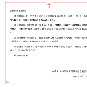 数据显示,春节假期前两天游客接待量前五的景区分别是:夫子庙秦淮风光带、钟山风景区、玄武湖景区、牛首山文化旅游区、红山森林动物园。
