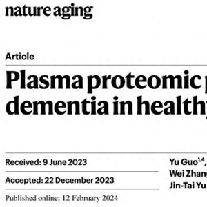 这项研究于当地时间2024年2月12日发表于《自然·衰老》(Nature Aging)杂志上,标题为《血浆蛋白质组学预测健康成年人未来痴呆风险》(Plasma proteomic profiles predict future dementia in healthy adults)。作者是来自复旦大学附属华山医院神经内科的郁金泰教授团队,以及复旦大学类脑智能科学与技术研究院冯建峰教授/程炜研究员团队。该研究被《自然》杂志社选为研究亮点(Highlight)。