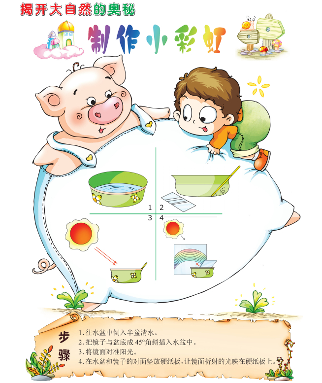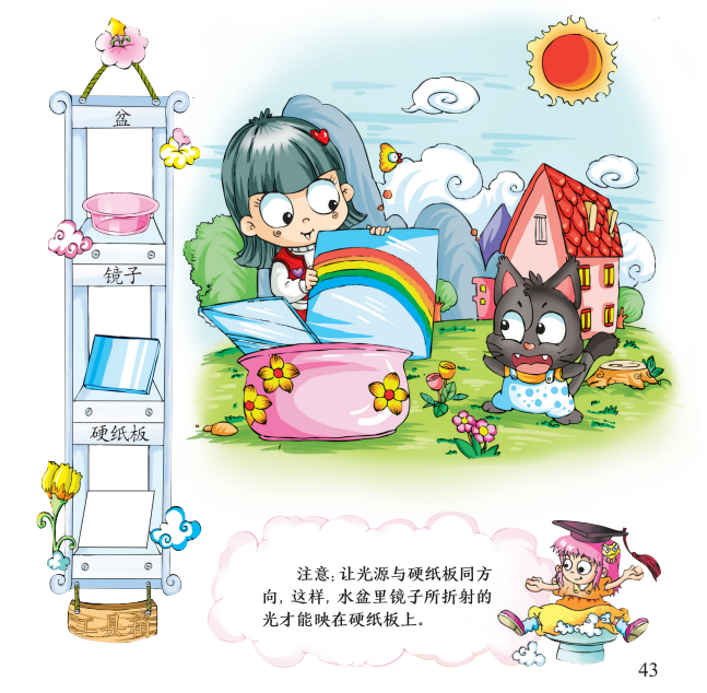 硬纸板上出现了一道美丽的小彩虹。这是因为阳光通过水折射到镜面上,折射光线被镜面反射,最后又被水面折射到硬纸板上。