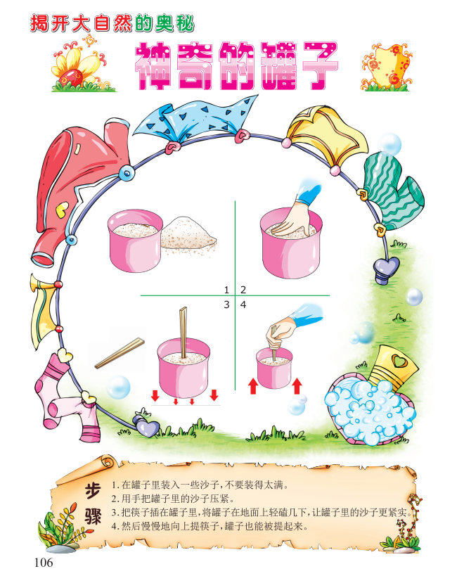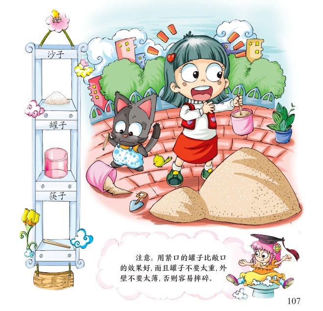 物体表面越粗糙或压力越大,摩擦力就越大。我们增加了沙子与罐子之间的压力,摩擦力也跟着增大,足以提起罐子。