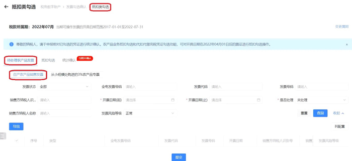 税务数字账户-发票勾选确认-抵扣类勾选-待处理农产品发票-“自产农产品销售发票”模块处理后(也就是系统会自动识别是不是“自产农产品销售发票”)