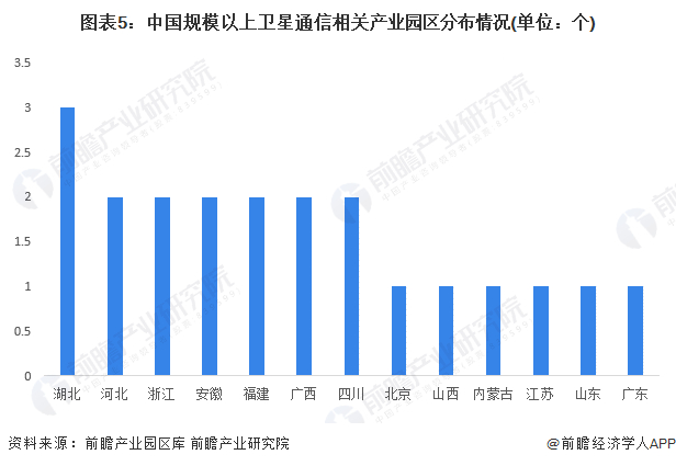 目前,我国针对卫星通信产业设立的产业园较少,据前瞻产业园区库不完全统计,我国规模以上的卫星通信产业园共21个,主要分布在湖北、河北等地,产业园区较为分散。