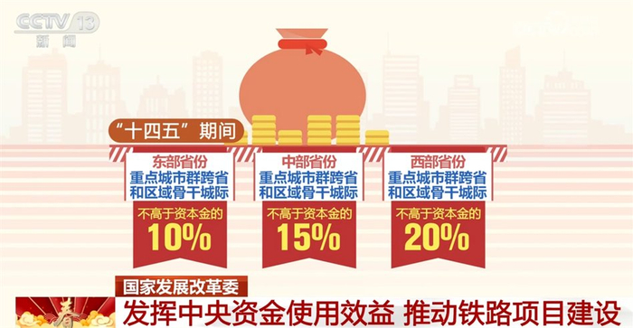“十四五”期间,中央预算内投资在西部、东北、中部地区干线铁路项目,累计安排规模分别不高于资本金的40%、40%、30%;东部、中部、西部省份重点城市群跨省和区域骨干城际,分别不高于资本金的10%、15%、20%;铁路货运能力提升项目安排规模不高于资本金的20%;中欧班列铁路基础设施提级改造项目,安排规模不高于资本金的20%;对涉及欠发达地区的铁路项目,以及国家战略明确支持的重大铁路项目,经论证可以适当加大中央预算内投资支持力度。