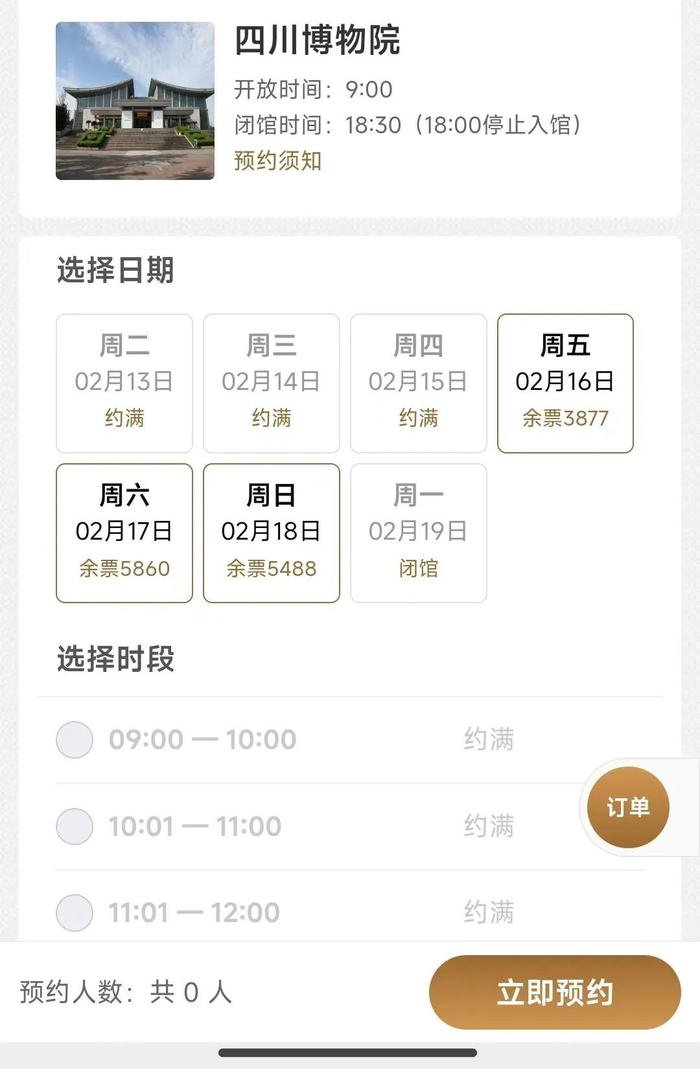 经查询发现,四川博物院2月13日-2月15日门票已约满,未预约勿前往。