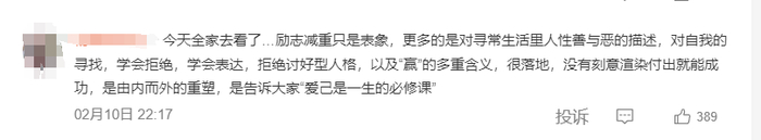 作为一个非常真诚的女性成长故事,贾玲想传达的从来不是身材焦虑、而是女性应该如何杀死“讨好型人格”,如何拼尽全力的爱自己,为自己而战。