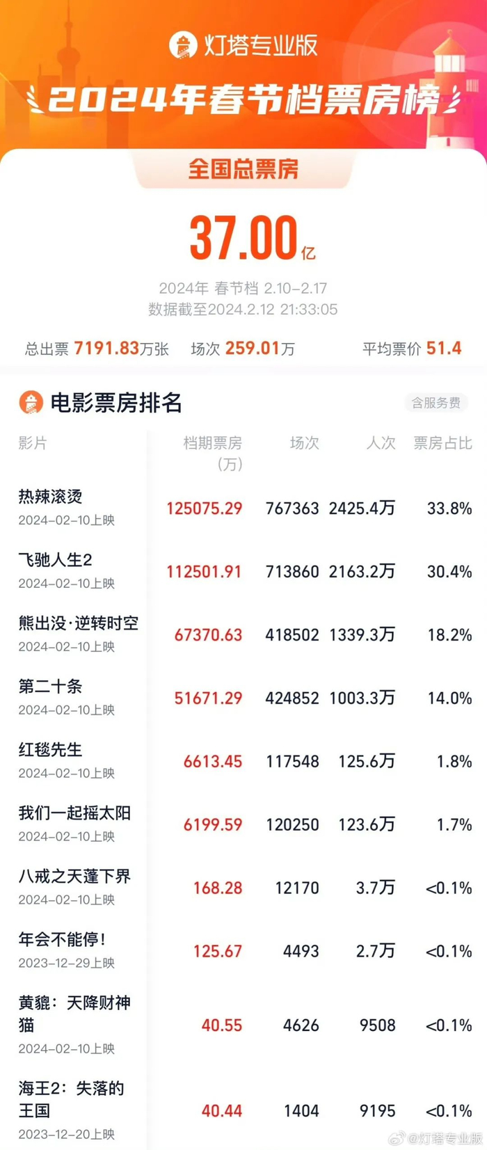 截止发稿前,《热辣滚烫》已经以12亿票房冲到了春节档榜首,既领先众星云集的《飞驰人生2》、《红毯先生》,还把《熊出没》等传统春节档大户远远甩在身后。