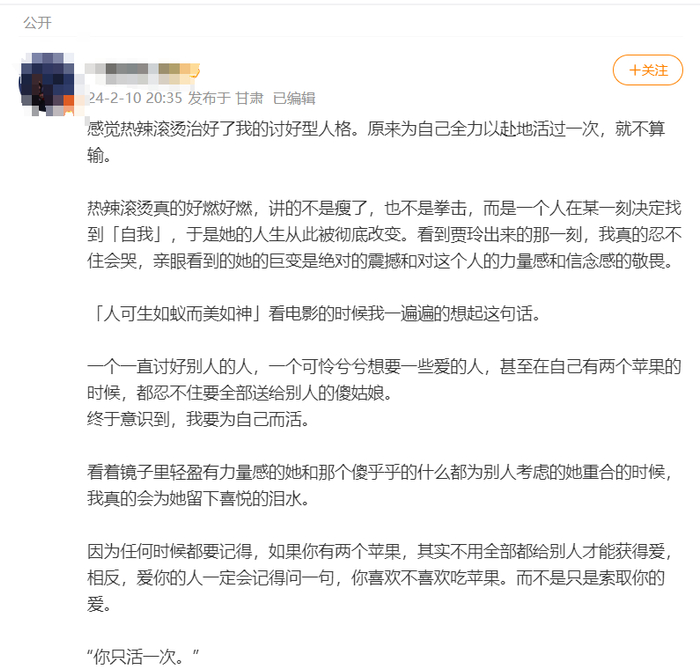 在微博上,有一篇热度很高的微博写道:原来为自己全力以赴地活过一次,就不算输。