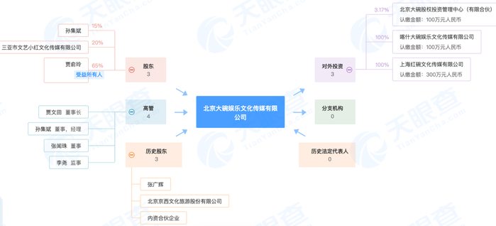 受开心麻花和德云社的模式启发,那一年,贾玲注册北京大碗娱乐文化传媒有限公司(后称大碗娱乐)。天眼查信息显示,贾玲(实名贾俞玲)持股大碗娱乐65%,与其合作多年的编剧孙集斌持股15%,小红文化持股20%,贾玲父亲贾文田为董事长。