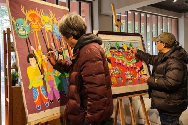对每一位中国人来讲,一年中最重要的节日非春节莫属。同样,对金山区的农民画作者来讲,春节更是画作的重要灵感来源。记者在现场看到,金山农民画区级传承人、区民间文艺家协会副主席曹金根创作的《舞龙闹新春》,画作已经基本完成上色,他正忙着最后的细节打磨。