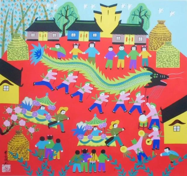 作品中,一条大龙“盘踞”中间,舞龙人手持龙具“奔跑穿行”;旁边,花船舞正在进行中;两侧,人们敲锣打鼓、欢呼雀跃……方寸之间,一场乡村舞龙表演正热闹上演。“龙在中国传统文化中具有非同一般的地位,一个多月前,我就开始构思如何构图。画中的龙寓意着幸福、吉祥,这幅闹新春表达的是对新一年的祝福和期盼。”曹金根说。