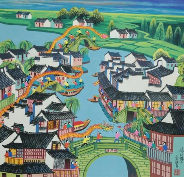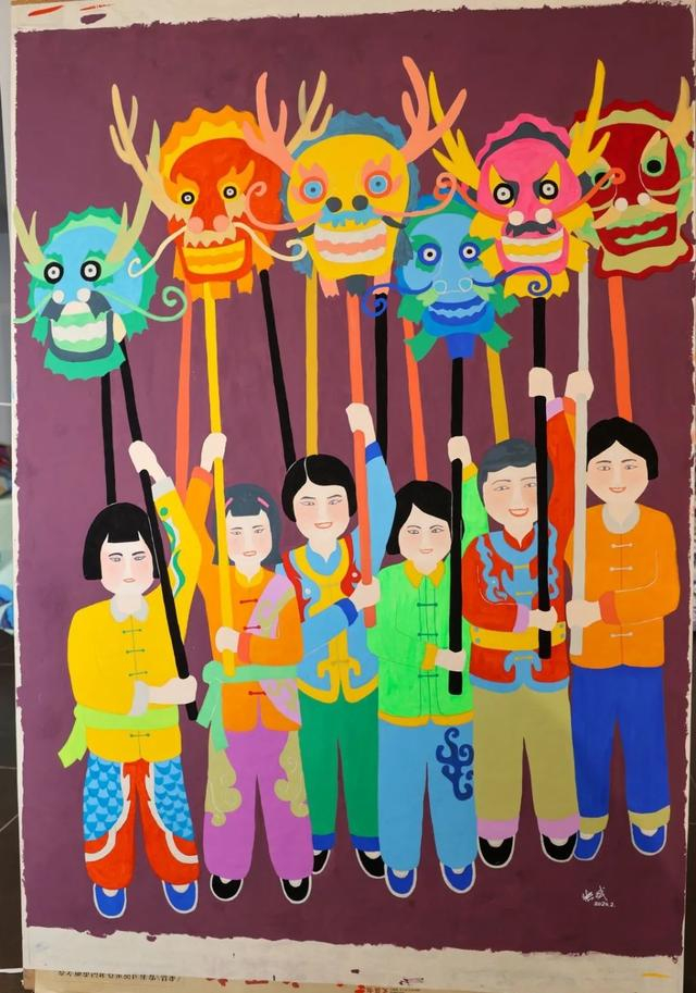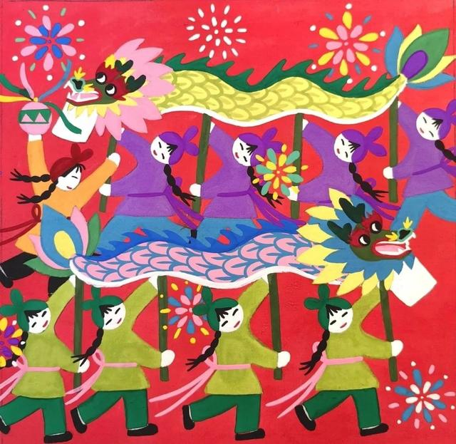 “这幅画中6名手持龙头的青年就是我目前任教的城建学院舞龙队的队员,他们穿的衣服也正是舞龙时穿的传统服饰。”他一边端详着作品,一边向记者介绍,“作为非遗传承人,我很高兴看到,各类非遗项目进校园工作全面铺开。就以金山农民画为例,已经实现了教材进校园、画展进校园、画家进校园,丰富的金山农民画拓展性课程让金山品牌文化枝繁叶茂。我想100个孩子里只要有1个能把非遗文化转为爱好,我们的传统文化就能代代相传,永葆生命力。”