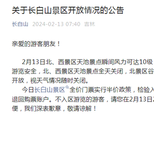 2月13日早上,吉林省长白山景区管理有限公司通过官方微信公众号发布《关于长白山景区开放情况的公告》。公告称,长白山部分景点关闭,当日长白山景区全价门票实行半价政策。