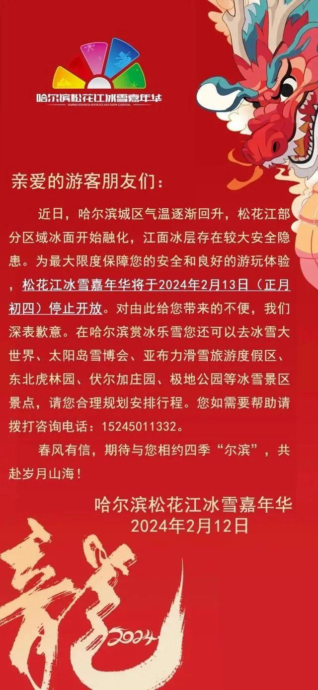 2024第六届哈尔滨松花江冰雪嘉年华于2月12日正月初三21时闭园,2月13日正月初四停止开放。为确保哈尔滨松花江冰雪嘉年华拆除收尾工作安全稳定运行,2月12日,哈尔滨文化旅游规划设计院组成巡检组,对嘉年华园区进行了营业期内的最后一次安全巡检,并对娱乐项目商户、工程安保部传达了闭园通知,要求2024年2月13日开始有序进行撤场拆除工作,2月24日前拆除结束。