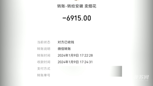 李女士告诉民警, 这位卖家是自己另一位网友介绍认识的,他自称开烟花厂的,李女士买烟花可以拿工厂价,卖家通过微信发来了烟花照片供李女士挑选,为了回老家放烟花,李女士最终花了包括运费在内的10315元,购买了种类不同的烟花。