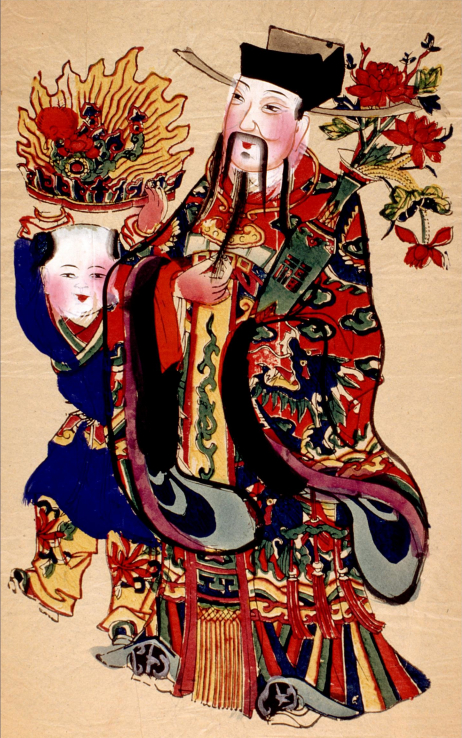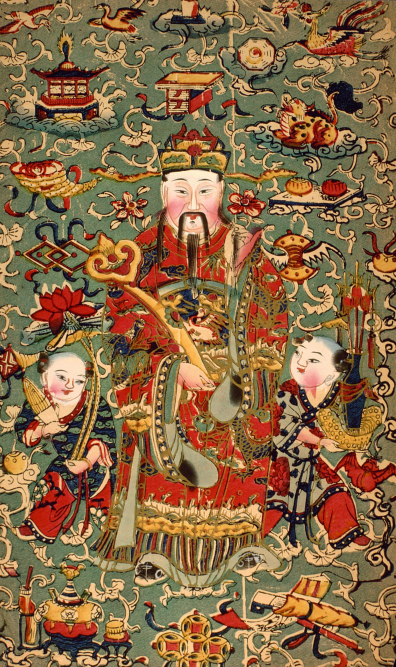 中路财神:王亥(传说是夏朝商国的第七任君主,鼓励人们用牛车拉着货物外出做交易,被人们称为“华商始祖”)