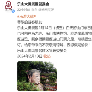 乐山大佛景区管委会消息,乐山大佛景区2月14日(初五)白天游山门票已售罄,您可选择夜游凌云山项目,也可前往乌尤寺、乐山市博物馆、麻浩崖墓博物馆等区域免费游览,或前往周边景区游览。剩余假期景区游山门票充足,可根据您的游览行程安排提前进行网上预订。