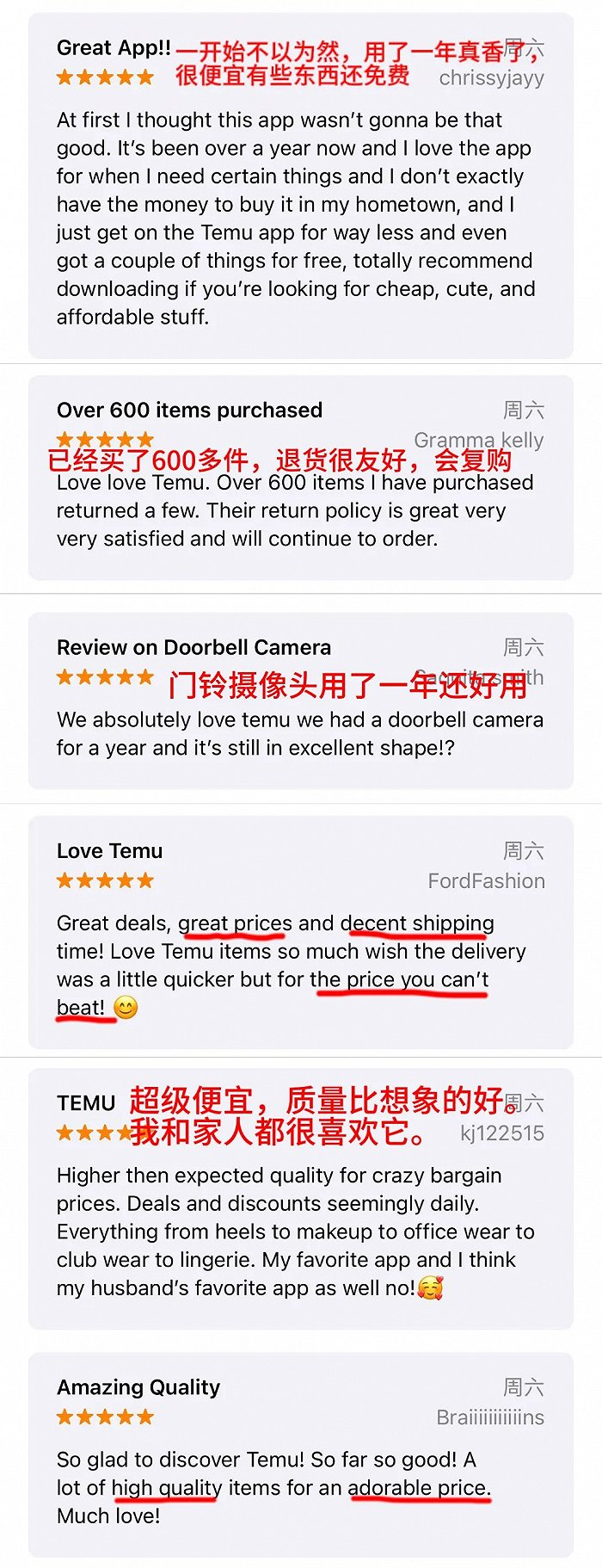 「price」和「quality」是被提到最多的两个关键词。在持续高通胀的背景下,极致低价的同时保持质量可用,正是TEMU在美国最大的杀手锏。评论区中不乏黏性消费者留下的好评。