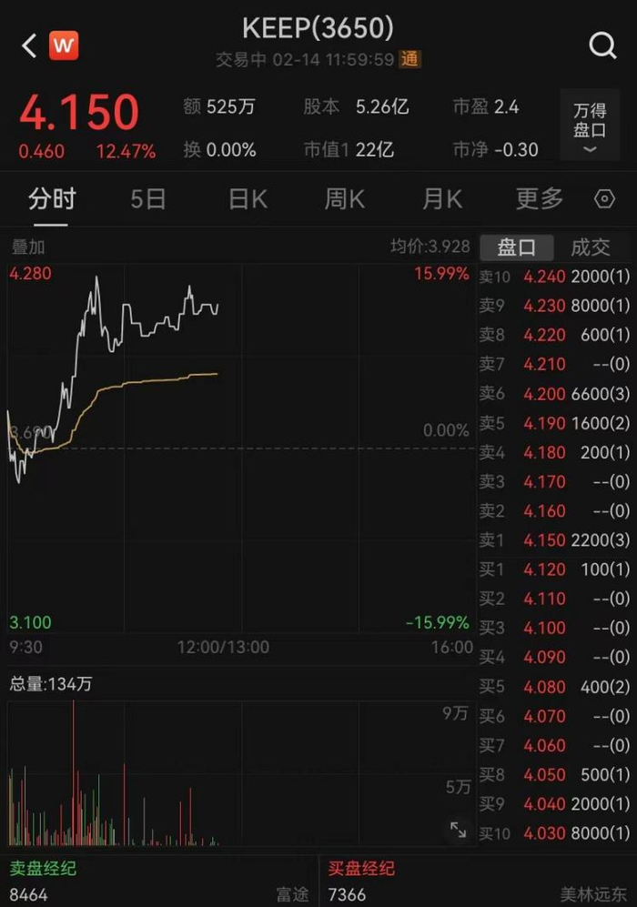 可选消费行业个股KEEP高开近3%,盘中一度涨超15%,截至午间收盘,涨12.47%,报4.15港元,最新市值为22亿港元。