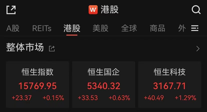 截至午间收盘,恒指涨0.15%报15769.95点;恒生科技指数收涨1.29%报3167.71点;国企指数收涨0.63%报5340.32点。