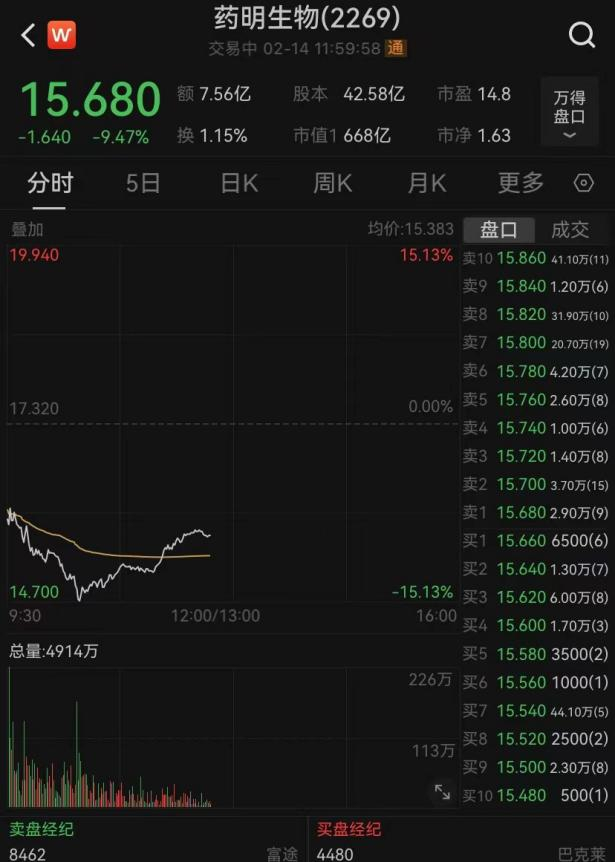 药明生物一度跌超15%,最低至14.7港元,创下2018年1月底以来新低,午间收盘跌9.47%,半日市值大约蒸发69.83亿港元,最新市值为668亿港元。