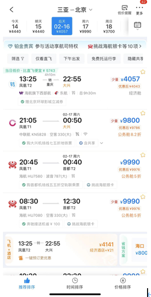 比如在携程平台上,2月16日从三亚飞北京,经重庆转机的航班,机票价格4000元多一点;2月17日,从三亚直飞沈阳最低也要一万元左右,若选择经西安中转,价格不足5000元,便宜一半。