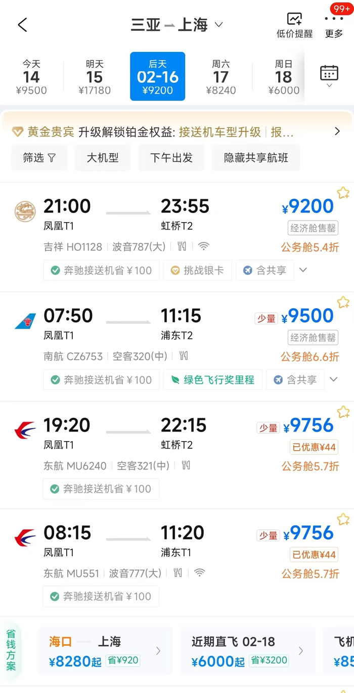 从2月15日到2月19日的未来五天,不管是从海口还是三亚还是博鳌直飞北京和上海的经济舱机票均已售罄。