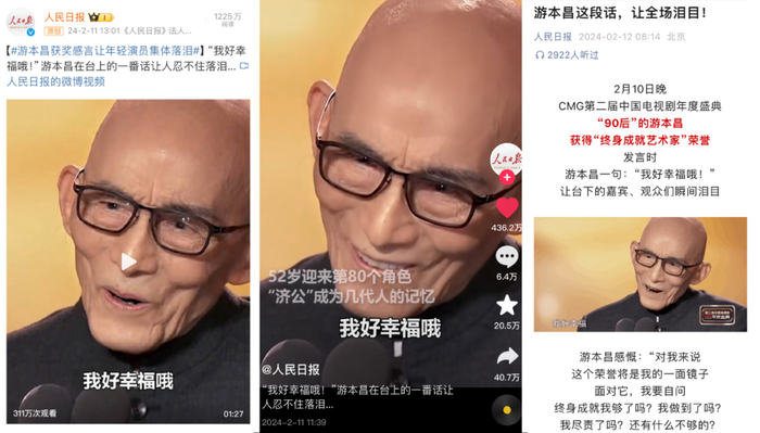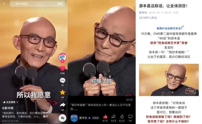 游本昌感言视频获央视新闻、央视网、央视频、人民日报、新华社等众多主流媒体在微博、微信、抖音、快手等多个平台接力报道。