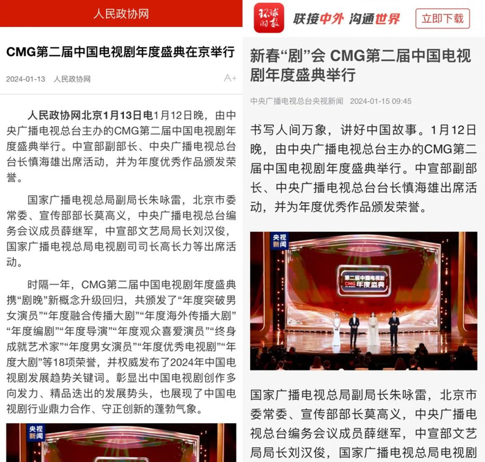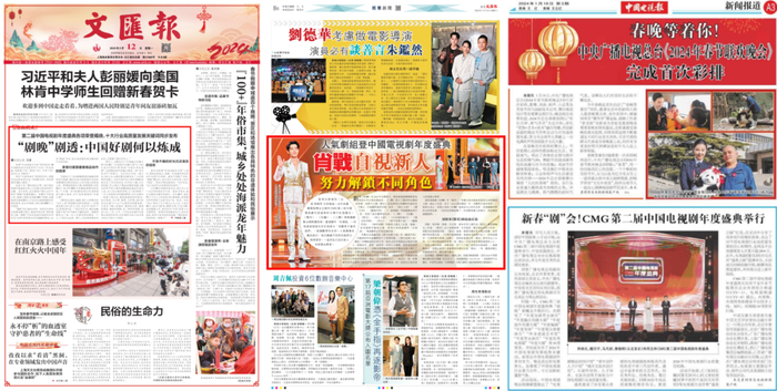“剧晚”播出前后,《文汇报》《香港文汇报》《大公报》《文艺报》《中国电视报》《中国新闻出版广电报》等刊文报道,新华网、人民日报客户端、光明网、环球网、中国青年网、中国艺术报等数百家重点媒体报道推荐,充分肯定了总台第二届中国电视剧年度盛典召开的意义和价值。