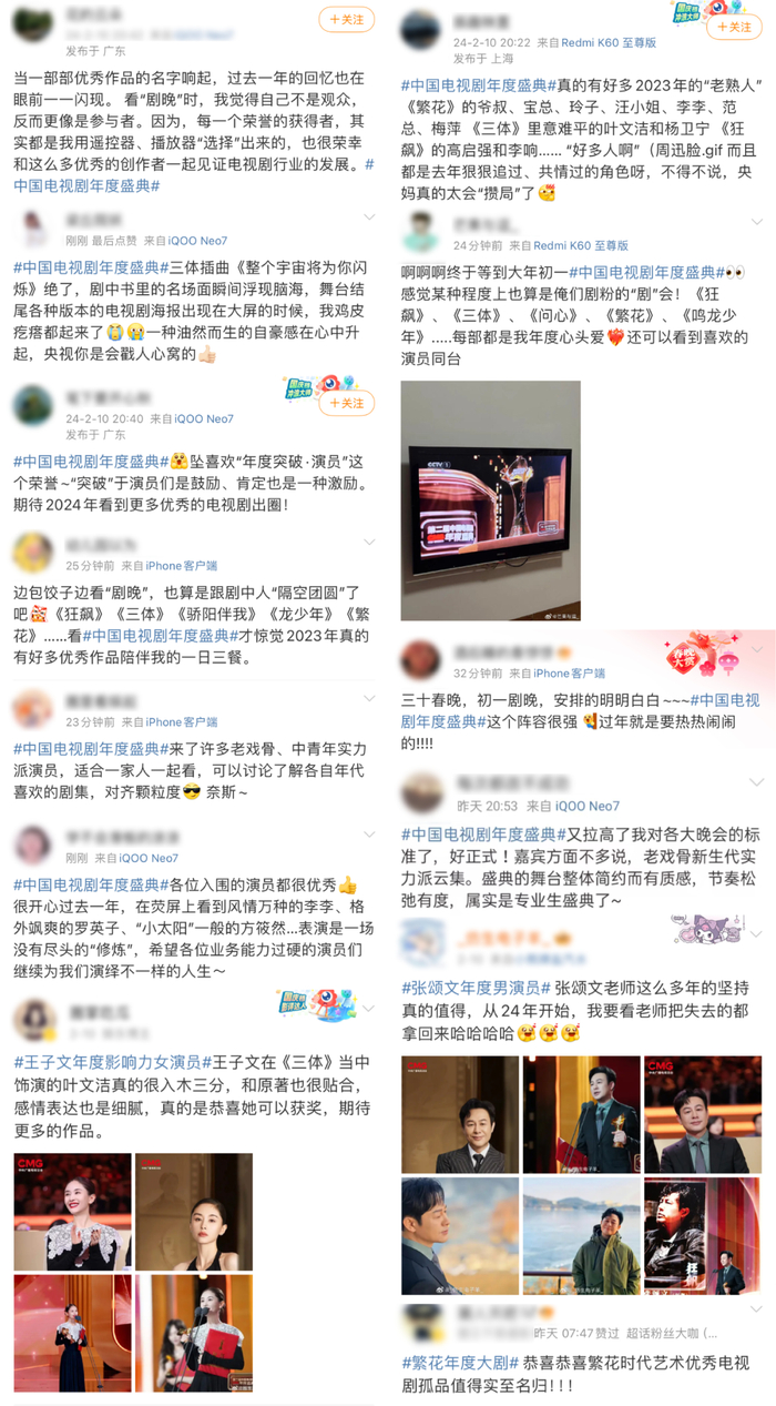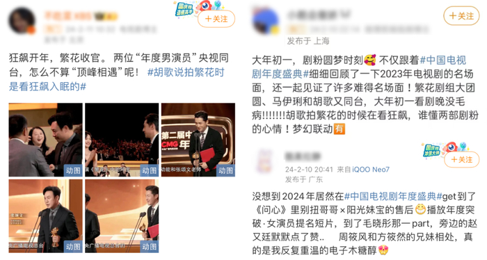 凭借优质的口碑、持久的传播力,“剧晚”引发了一轮轮热门话题讨论,#中国电视剧年度盛典#、#第二届中国电视剧年度盛典荣誉名单#、#肖战年度突破男演员#、#胡歌说拍繁花时是看狂飙入眠的#、#张颂文广东话拜年# 、#张颂文胡歌同获年度男演员#等多角度话题刷屏热搜榜,“剧晚”的热度与影响力在春节白热化的竞争中格外出挑。