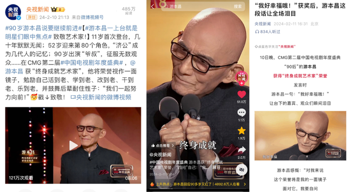 衍生话题#游本昌终身成就艺术家#、#游本昌获奖感言让年轻演员集体落泪#、#游本昌喊话年轻人要耐住性子#、#游本昌:我好幸福#、 #90岁游本昌说要继续前进#纷纷登上各大平台榜单。