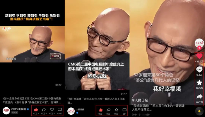 截至2月12日,相关视频在CCTV电视剧、人民日报视频号的点赞、转发、收藏各维度数据均破10万,人民日报抖音点赞量超400万。