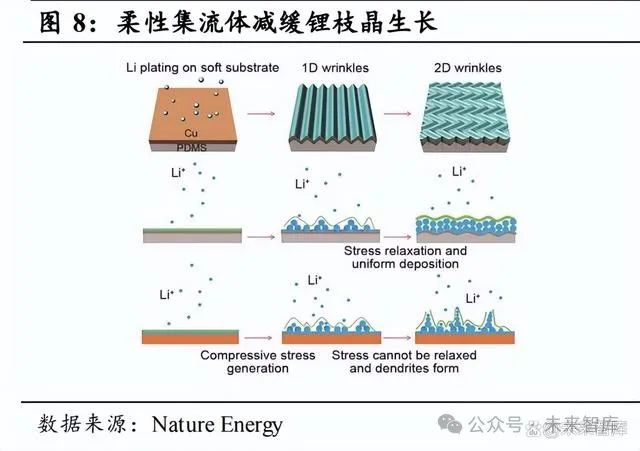 复合集流体可以抑制锂枝晶的生长,在穿刺时产生的毛刺尺寸小,可以 有效避免内短路。复合集流体中的高分子柔性基材具有好的柔软性与延 展性,可以吸收部分应力,不容易断裂;同时可以在金属锂的沉积过程 中将产生的压应力释放,从而有效控制枝晶产生,防止穿刺导致内短路。 即使受到穿刺,复合集流体材料的 1μm 镀铜层所产生的毛刺尺寸小, 不足以刺穿隔膜,可以效避免内短路。 复合集流体的受热短路效应可以控制电池热失控。复合集流体具有传统 技术如在电解液中添加阻燃剂,仅能对内短路起到延缓作用,而且以牺牲电池能量密度为代价。而复合集流体中间的高分子基材具有阻燃特性, 其金属导电层较薄,短路时会如保险丝般熔断,在热失控前快速融化, 电池损坏仅局限于刺穿位点形成“点断路”。