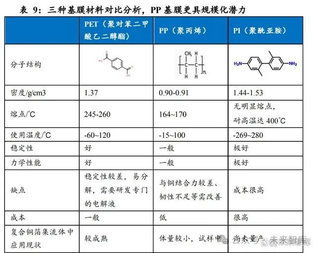 由于两种基材可能分别适用于不同类型的锂电池,因此选择 PP / PET 目前尚无定论,长期看 PP 基膜有望占主导地位。1)PP 基膜:电池的 充放电循环次数会更多,使用 PP 为基材的复合铜箔电池在实验的过程 寿命要比 PET 基材复合铜箔电池更长。对于电池厂商而言,在实验环节 PP 基材各方面性能满意程度更高。然而相较于 PET,PP 膜材料硬度低, 不好加工,前期良率很低。同时初始阶段各方面工艺尚不完善,容易在 磁控溅射环节打穿 PP 基膜。由于 PP 分子中不含酯键,相较于 PET 具 有更优异的耐酸碱性。2)PET 基膜:更好加工,良品率更高,综合成本 更低一点。对于复合铜箔厂商而言,大规模量产 PET 铜箔,成本、良率、 一致性都要比 PP 铜箔更好。3)PI 基膜:密度类似 PET,但熔点和使用 温度最高,整体稳定性及力学性能最佳。但成本较高,目前不具备市场 潜力。