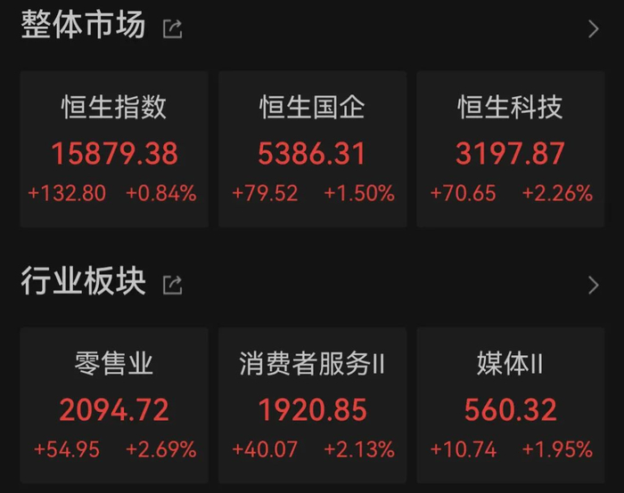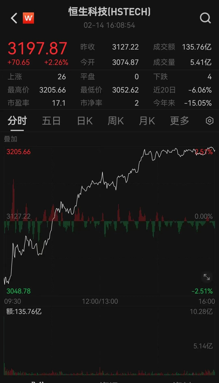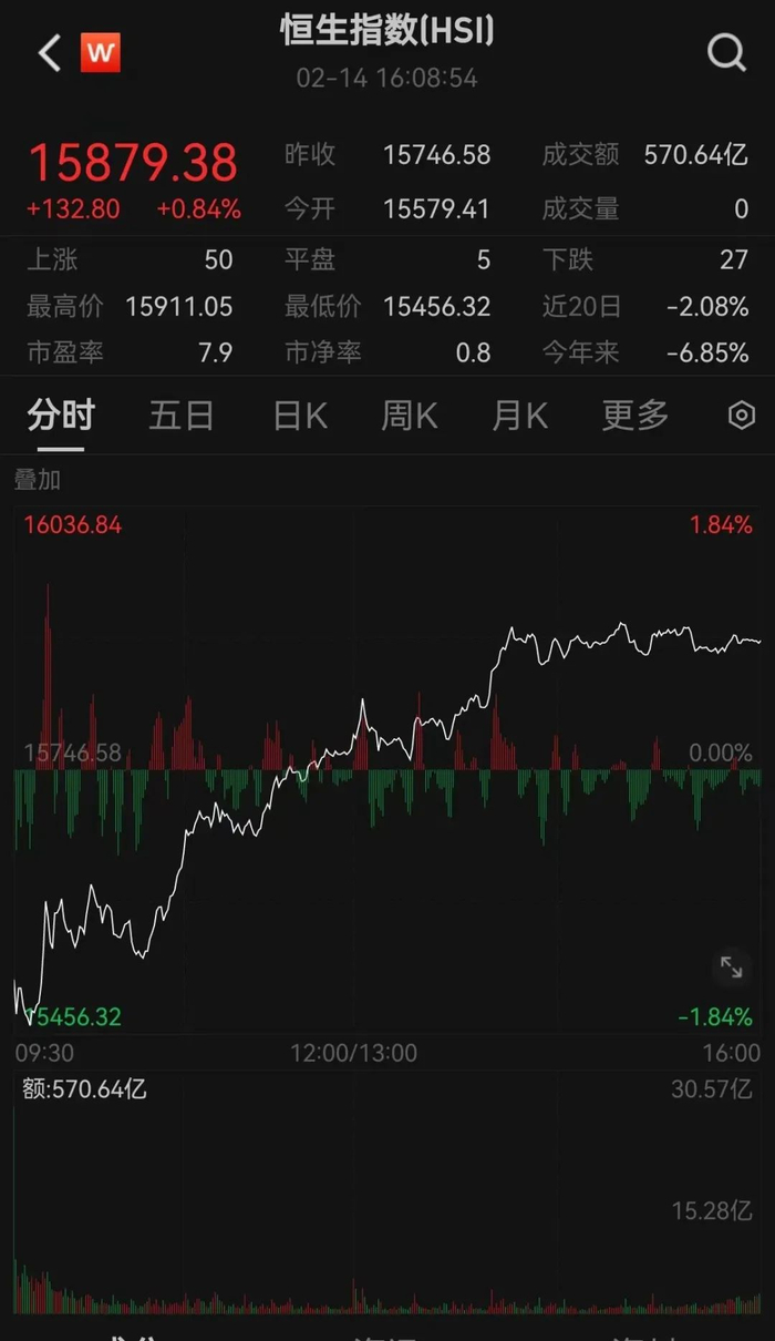 2月14日,龙年第一个交易日,港股低开高走,实现开门红。恒生指数上涨0.84%,报15879.38点,恒生科技指数上涨2.26%,报3197.87点,恒生国企指数上涨1.50%,报5386.31点。