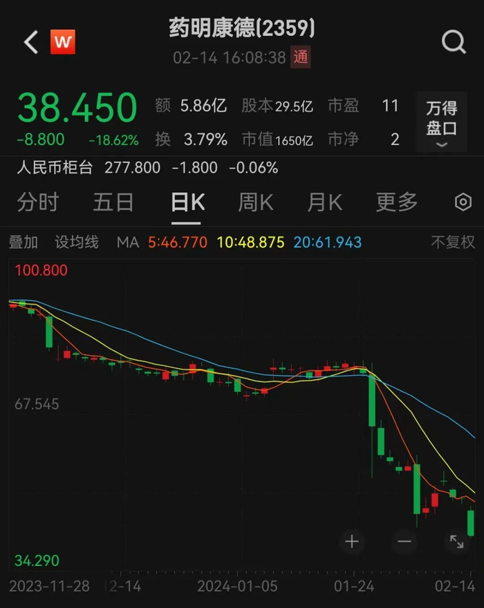 2月14日,港股药明系下挫,药明康德下跌18.62%、药明生物下跌9.24%。