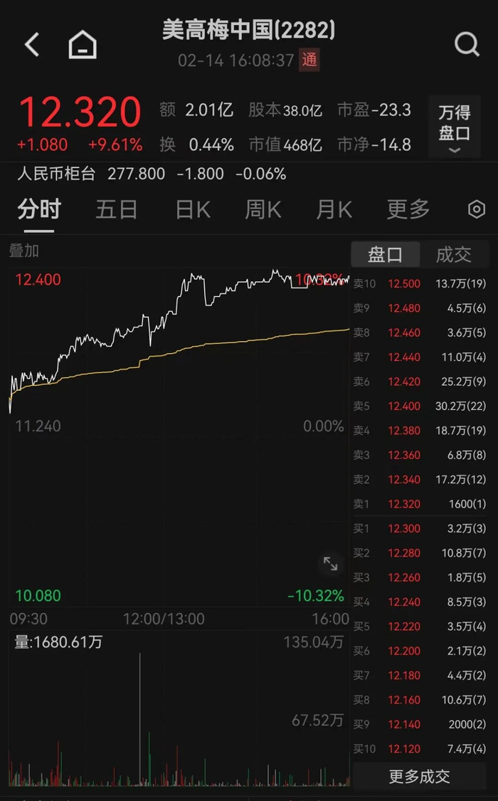2月14日,博彩股美高梅中国上涨9.61%。