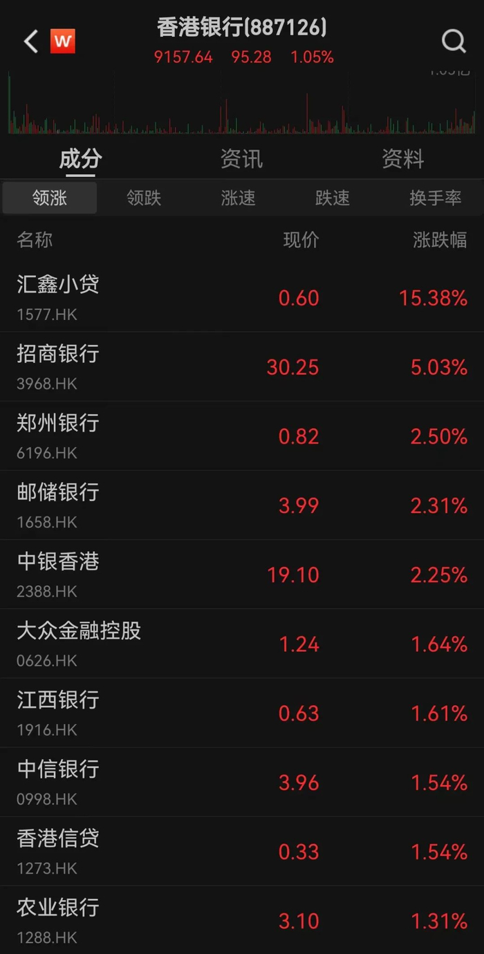 2月14日,港股银行股走高。招商银行大涨超5%,邮储银行上涨2.31%、农业银行上涨1.31%、江西银行上涨1.61%、中信银行上涨1.54%。