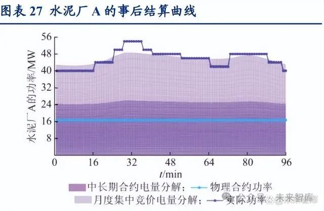 从发用双方的交易曲线来看,阴影部分(中长期/月度合约分解电量)与实际用电负荷 (折线为实际功率)之间的缺口/盈余即为需要通过现货市场调节的部分,对于电厂 B 与水泥厂的最终交易结果参考图。