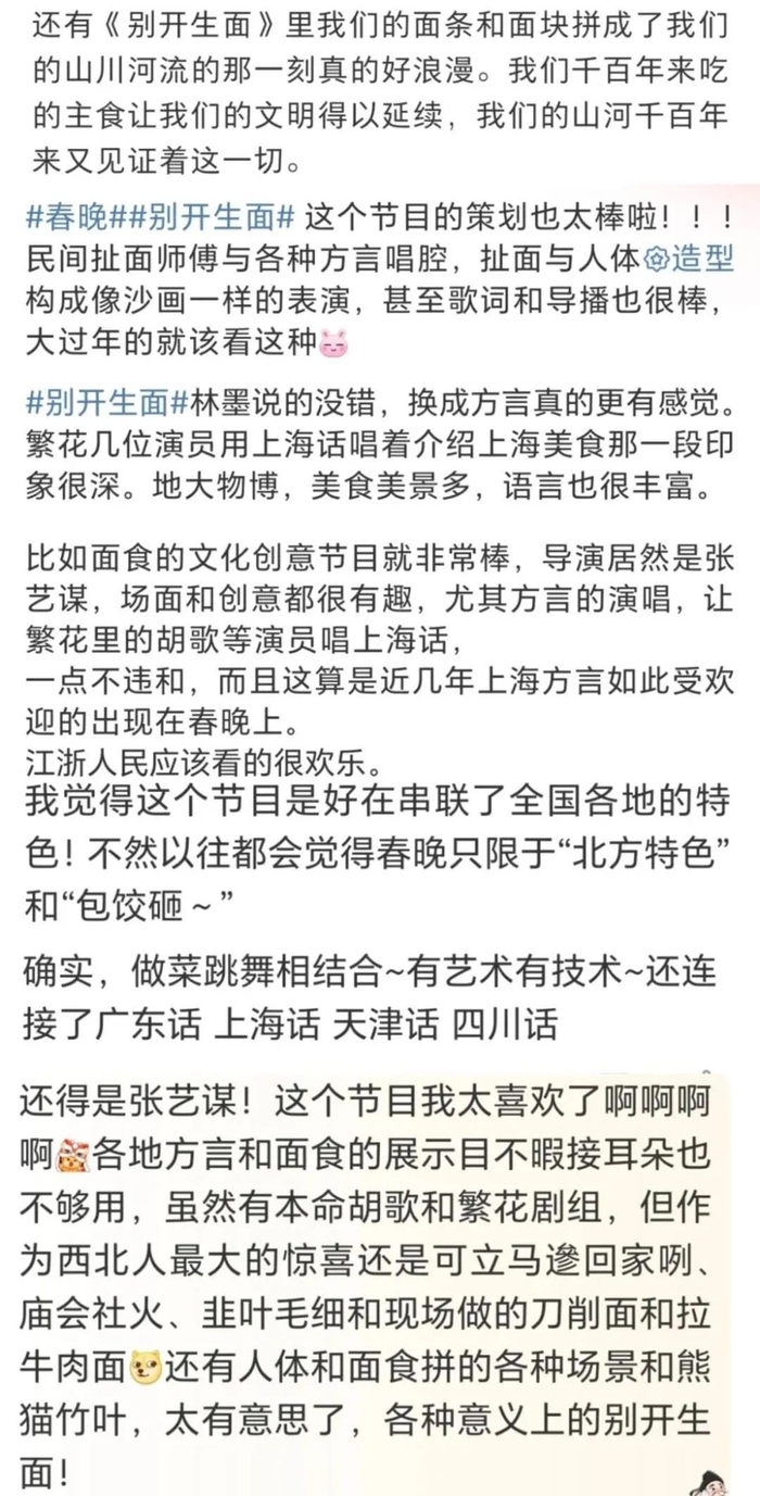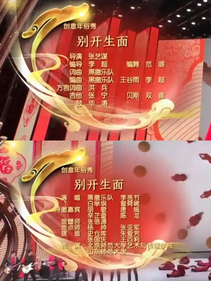 导演组透露,张艺谋导演的创意年俗秀《别开生面》脱胎自大型驻场观念演出《无界·长安》,在创作之初其实是个主打陕西面食的节目。慎海雄台长在审看节目时向导演组建议,今年春晚有四大分会场,陕西西安是其中之一,节目在目前已有的“biangbiang面”等西北面食之外,还要把更多南方受众熟悉的面食写进去,像是上海的阳春面、粢饭糕,广东的竹升面、云吞面,杭州的片儿川等等,刚好总台开年大剧《繁花》热播,可以考虑请剧组到场用上海话唱一下,广东点心请粤语歌手唱个名。