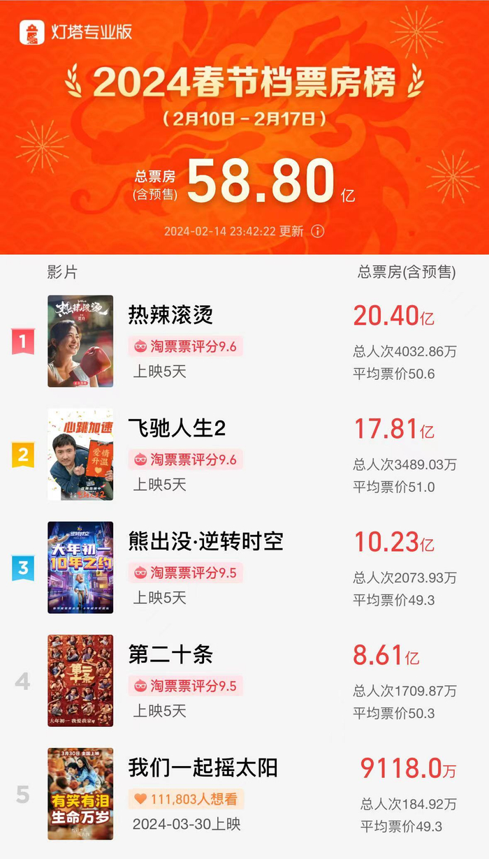 据灯塔专业版实时数据,截至2月14日23时42分,影片《我们一起摇太阳》总票房(含预售)为9118万元,排名第五。前四名为《热辣滚烫》《飞驰人生2》《熊出没·逆转时空》《第二十条》,总票房(含预售)分别为20.40亿元、17.81亿元、10.23亿元、8.61亿元。