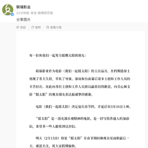 2月14日21时许,@联瑞影业 宣布,目前在映中的电影《我们一起摇太阳》将退出春节档,延后至今年3月30日上映。2月15日将是“摇太阳”在春节期间和观众见面的最后一天。