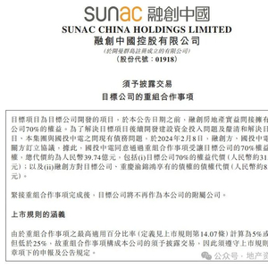 2月9日,融创中国(01918.HK)公告称,将以39.74亿元人民币的价格出售四川项目70%股权。