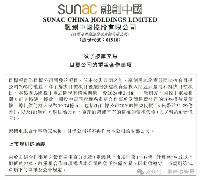 公告披露,融创房地产实际间接拥有目标公司四川三岔湖长岛国际旅游度假中心有限公司70%的权益。为了解决目标项目后续开发建设资金投入问题及厘清和解决目标项目、集团与国投中电之间现有债务问题,于2024年2月8日,融创方(融创房地产、环融会展、成都铭簏的统称 )、国投中电及相关方订立协议,据此,国投中电同意通过重组合作事项受让目标公司的70%权益及债权,总代价约为人民币39.74亿元,包括目标公司70%的权益代价(人民币约31.29亿元);以及融创方对目标公司、重庆渝锦鸿享有的债权的债权代价(人民币约8.45亿元)。