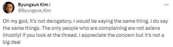 天哪,这不是贬义词。我也会说同样的话。如果你看一下这个帖子,那些抱怨的人不是亚裔(大多数)。我很感激你们的关心,但这没什么大不了的。